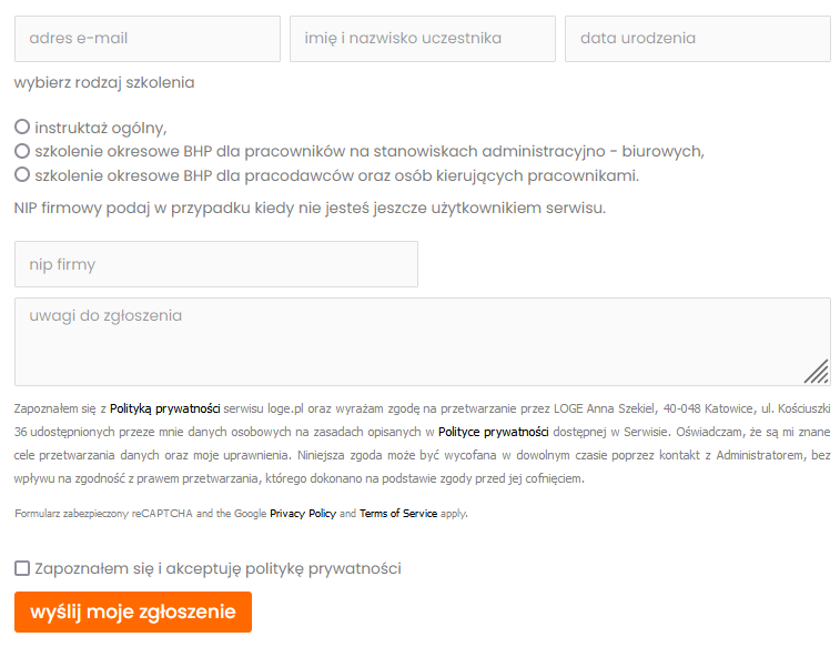 Możesz skorzystać z formularza wypełniając prawidłowo dane. W formularzu rejestracyjnym należy podać swój adres e-mail lub firmowy (imienny), podać swoje imię, nazwisko oraz datę urodzenia, należy również zaznaczyć jakie szkolenie mamy Tobie przydzielić. Opcjonalnie można podać NIP firmy co przyśpieszy realizację.
