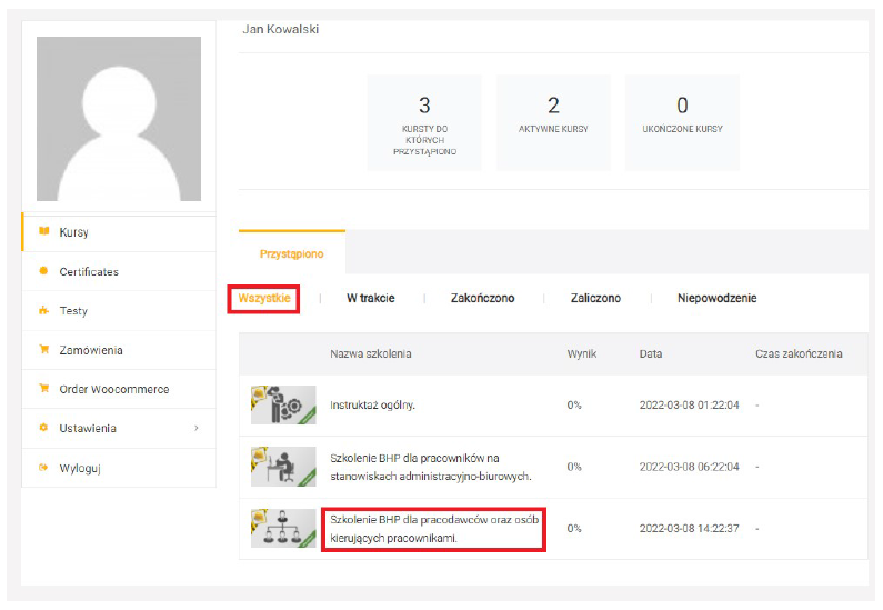 Automatycznie po zalogowaniu użytkownik widzi swój pulpit a w nim dodane szkolenia.